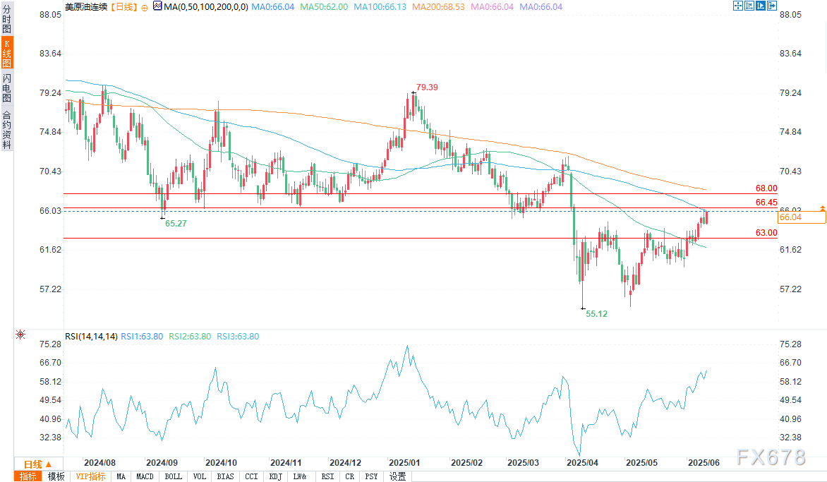 若空头重新掌握主动权,交易员将63.09美元视为近期支撑位。若成功上破66.45美元,可能打开通往下一主要上行目标68.21美元附近的空间。   欧佩克+增产,但国内需求或消化额外供应   欧佩克+计划7月增产41.1万桶/日,这是连续第四个月增产。但分析师称,其对全球供应的影响可能被削弱。沙特及其他欧佩克+成员国夏季国内需求可能增加,有助于消化新增供应量。据凯投宏观(Capital Economics)分析,这种内部消费短期内可能通过抵消供应增量来支撑油价。   中美贸易休战提振风险偏好,但需求疑问犹存   WTI触及七周高点,反映出中美贸易谈判后市场风险偏好回升。双方已就重启贸易休战及放宽稀土出口限制的框架达成一致,提振了市场情绪。   作为全球前两大石油消费国,紧张关系缓和降低了价格下行风险。然而,PVM分析师塔马斯·瓦尔加(TamasVarga)警告称,交易员仍不确定这一进展实际能在多大程度上转化为更强的经济活动或更高的石油需求。   伊朗威胁推升地缘政治风险溢价   地缘政治紧张局势再度成为焦点。美国总统特朗普对伊朗遏制铀浓缩的意愿表示怀疑,而伊朗则威胁称,若谈判破裂,将打击美国在该地区的基地。强硬言论为油价增添了风险溢价,交易员已将潜在冲突可能导致的供应中断计入定价。   美国能源信息署(EIA)报告前,原油库存成焦点   在EIA官方库存数据发布前,初步的美国石油协会(API)数据显示,上周美国原油库存减少37万桶。若该降幅得到确认,将为油价提供新支撑,强化周中交易的看涨基调。市场正静待EIA数据验证,交易员预期库存减少240万桶。   油价预测:关键阻力位上方看涨倾向增强