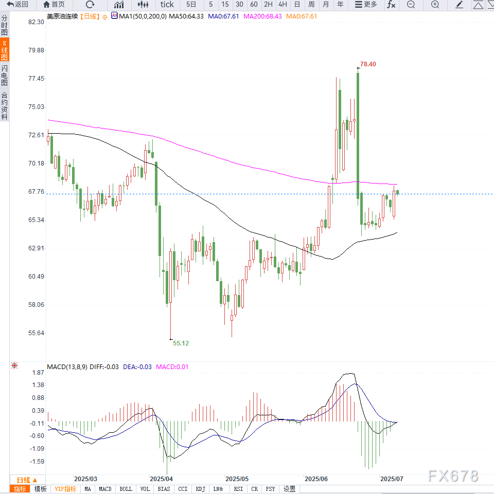 数据显示,美国独立日假期期间,预计有创纪录的7220万人出行,支撑短期成品油需求强劲。市场分析认为,这可能抵消一部分因全球经济担忧所带来的负面影响。   “强劲的美国汽油需求是当前支撑油价的关键短期因素。”——据市场调查显示某机构分析师表示   美国商品期货交易委员会(CFTC)数据显示,截至7月1日的一周内,基金经理大幅增加了原油期货和期权的净多头头寸,反映市场在进入美国假期前保持偏多操作情绪。   OPEC+决定八月增产54.8万桶/日,超出先前三个月的月增41.1万桶/日水平。   该决定几乎撤销了此前自愿减产的220万桶/日的剩余部分。高盛分析师预计,在8月3日召开的下次会议上,OPEC+将再宣布9月增产55万桶/日,从而结束当前的增产周期。   不过,值得注意的是,目前实际产量增长仍未完全达到公告水平,主要新增产量仍由沙特主导。   “虽然公告中的增产幅度较大,但多数成员国因技术或政治限制难以完全兑现,沙特依旧承担了大部分供给压力。”——能源研究公司Kpler指出   目前WTI原油价格徘徊于20日与50日均线之间,短期上行趋势暂未被破坏,但K线连续两日录得上影线,显示上方抛压逐步显现。相对强弱指数(RSI)位于50上方,尚未进入超买区间,MACD指标显示红柱动能收缩,或预示价格短期将震荡整理。   关键支撑位关注66.80美元附近(前期低点与上升趋势线交汇处),若跌破该位,将打开回测65美元的空间;而上方初步阻力位位于68.50-69.00美元区间,若能有效突破,有望重新挑战70美元关口。   “若WTI原油维持在66.80美元上方运行,整体偏多结构仍有望延续。”——据市场调查显示的技术分析观点