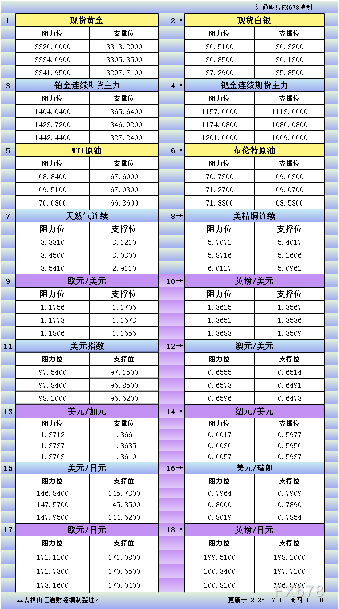嘉盛平台官网:7月10日亚市更新支撑阻力:18品种支撑阻力(金银铂钯原油天然气铜
